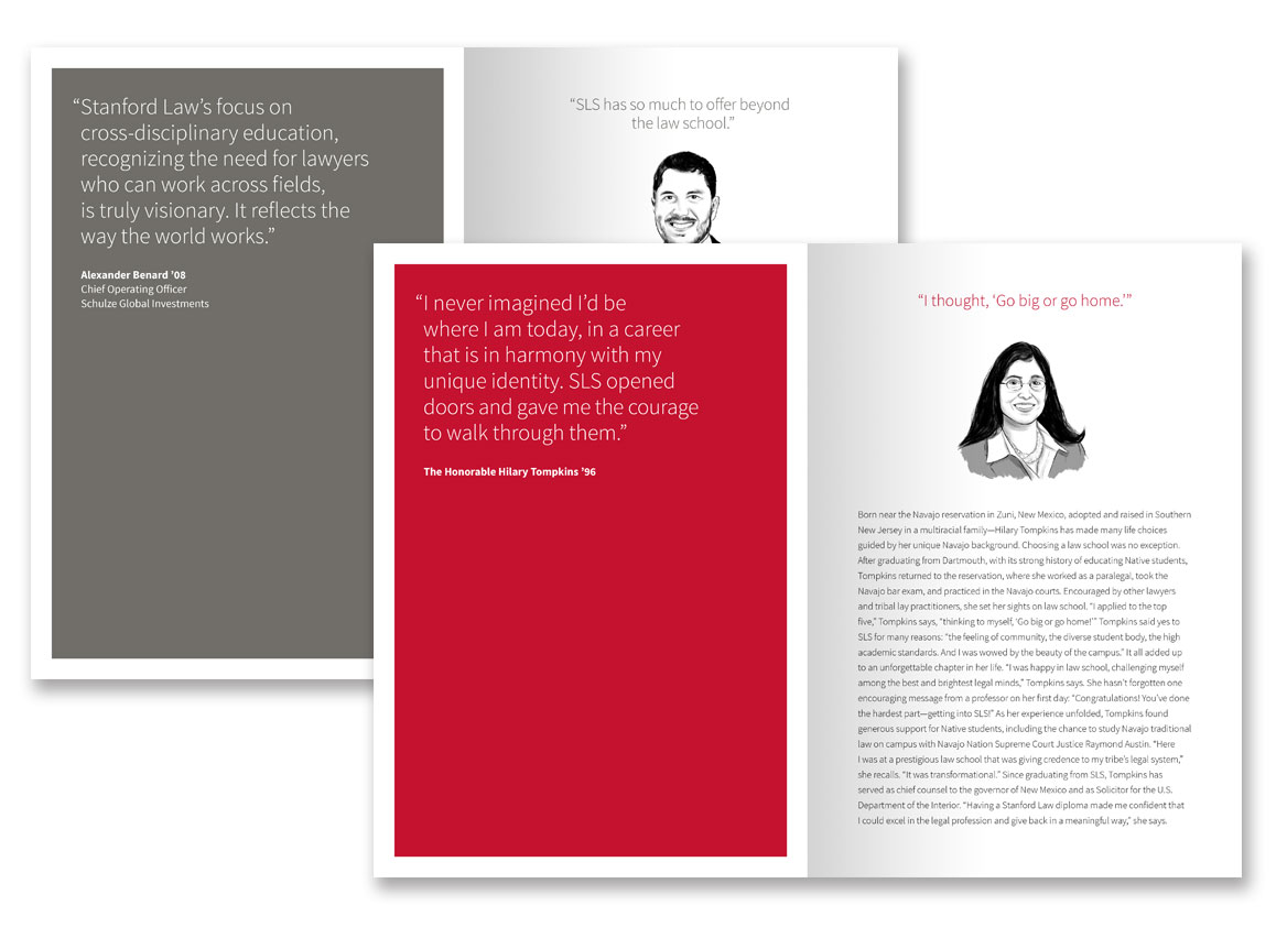 Choosing formats and styles that would authentically express Stanford Law’s identity and stand out in the law school landscape, we created three pieces: “Consider What Counts”—a two-sided card providing a numbers-driven, at-a-glance look at SLS distinctions; “Only at SLS”—a photo-driven roll-fold showcasing stand-out programs and opportunities; and “Yes”—the intimate stories (illustrated with pen-and-ink portraits) of nine alumni, students, and faculty who chose SLS as the law school that would shape their future.